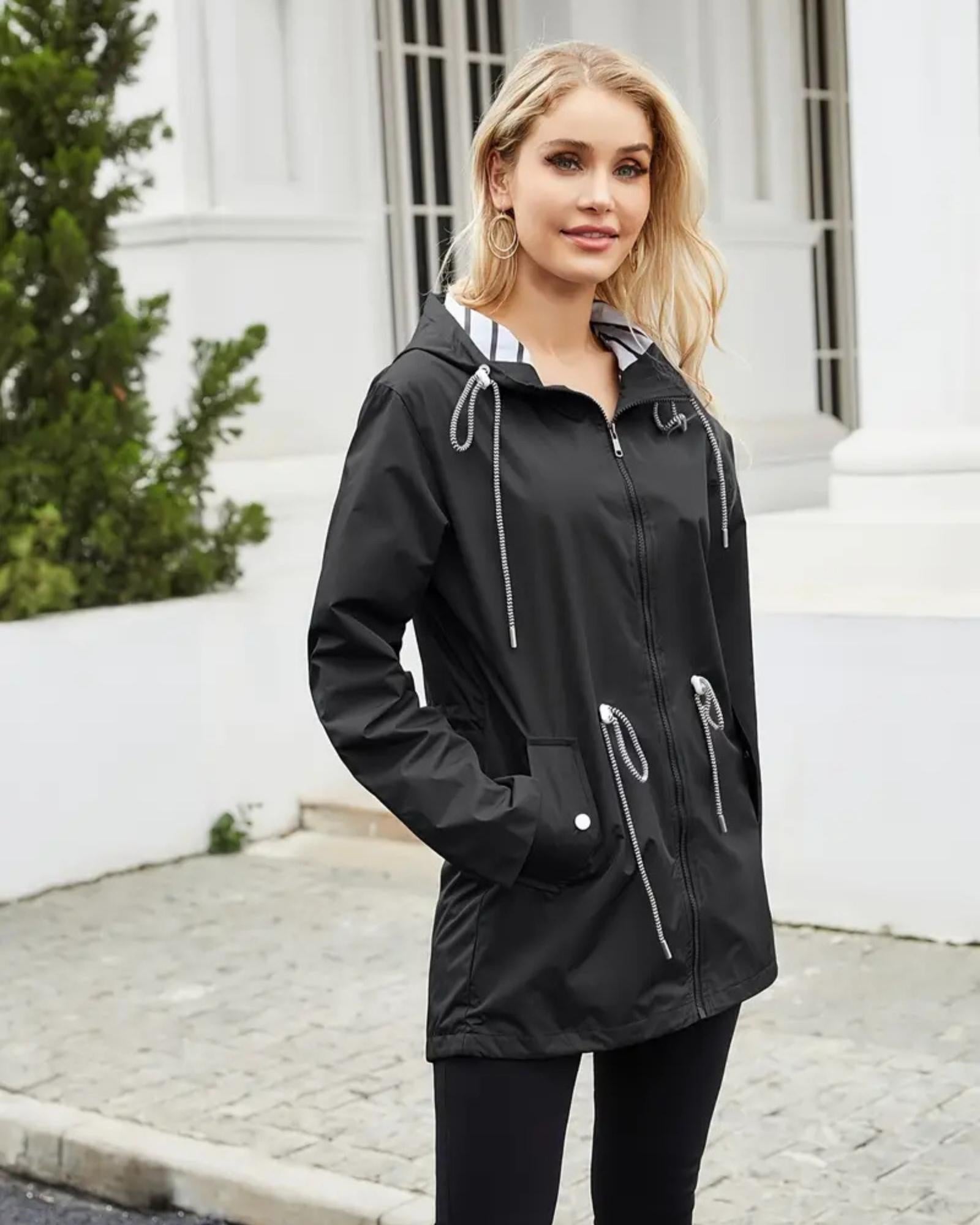 Stay protected in style on wet and windy days with the Amy Waterproof Jacket. Crafted with a water-resistant outer shell, breathable striped lining, and an adjustable waist, it’s the perfect companion for daily commutes, weekend strolls, or outdoor getaways. Lightweight and easy to wear, it zips up quickly when the skies turn grey.